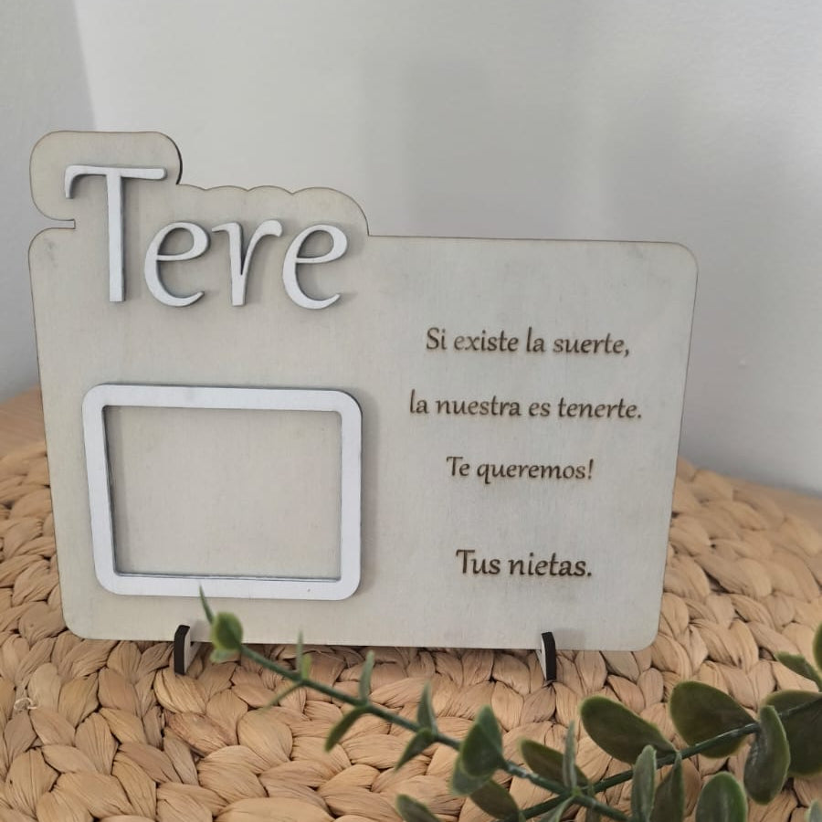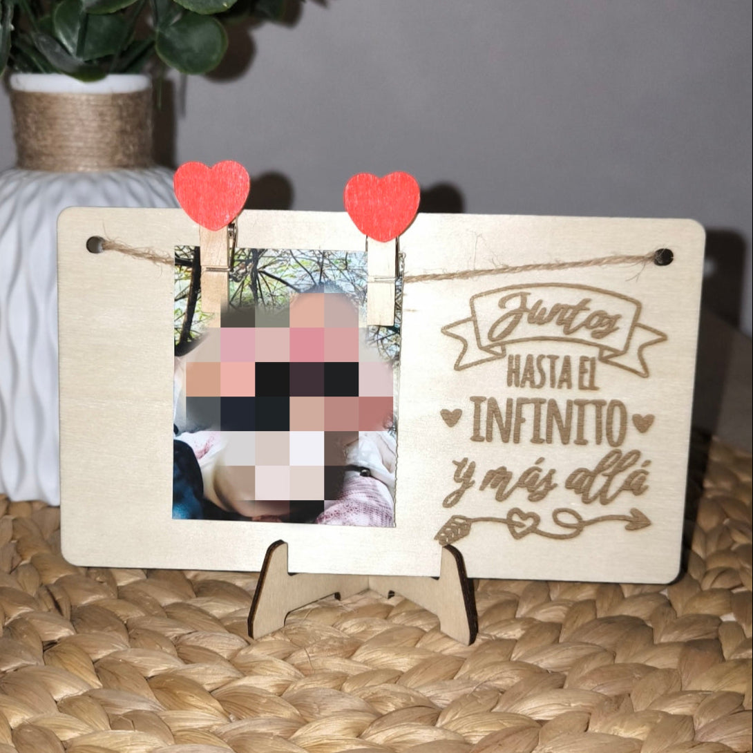 Marco de madera grabado a láser con soporte.