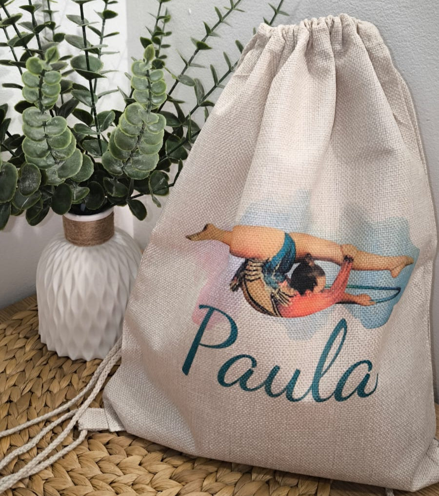 Mochila de cuerdas, en resistente poliéster de suave tacto, personalizable en sublimación. Con cuerdas autocierre en color natural y esquinas reforzadas.
