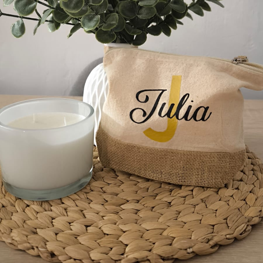 Neceser ideal para la playa o piscina de algodón y base de yute, personalizada con vinilo.