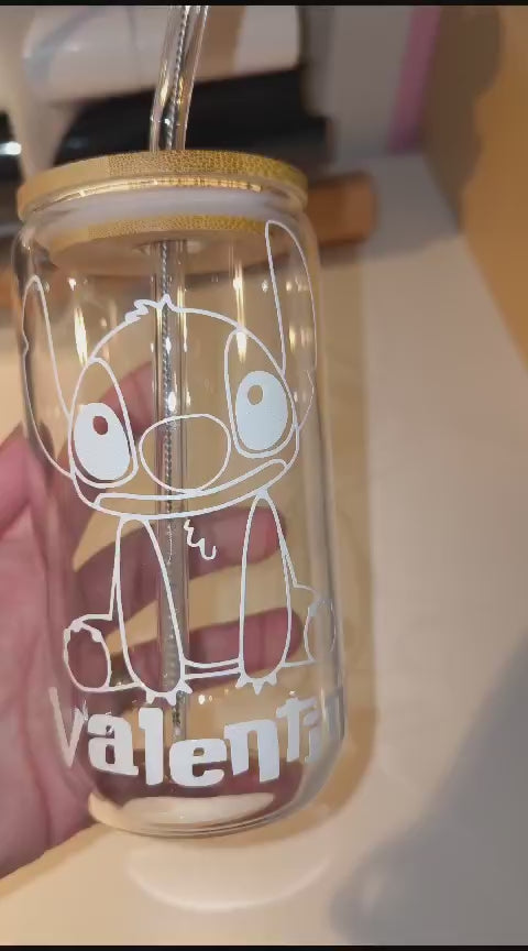 Vaso de cristal de gran capacidad con tapa de madera y pajita de cristal, personalizable con vinilo.